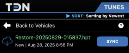 The first time a vehicle is read, a file folder for the vehicle will be added to the list at the top of the Tunes screen. |